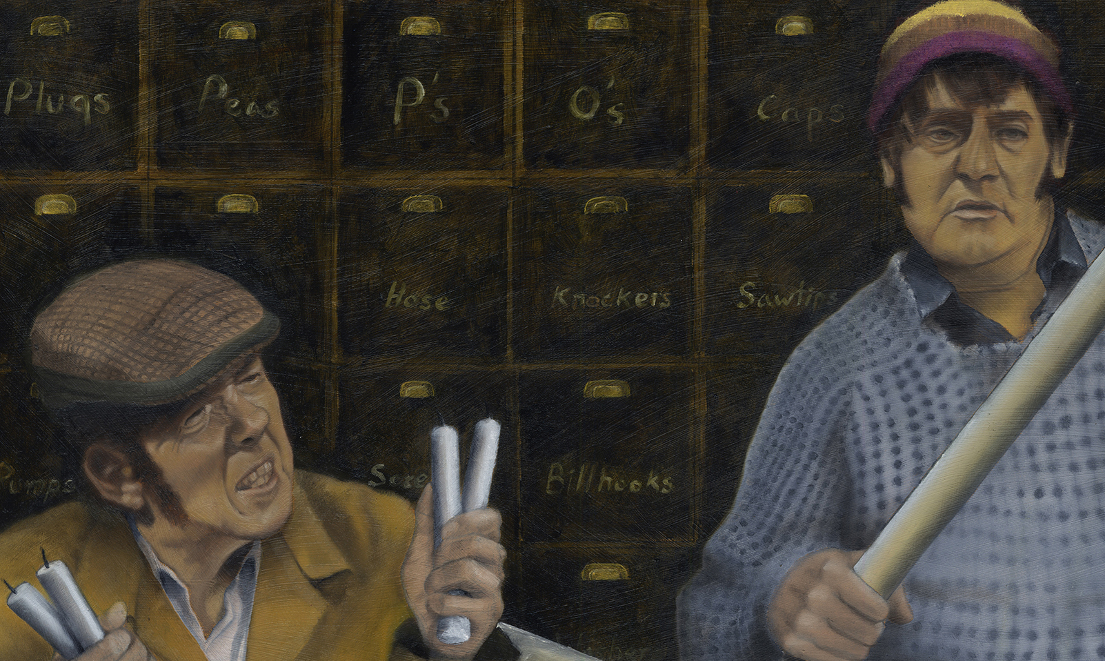 This series of artworks explores iconic British film references from our beloved 70's charismatic Carry-On personalities with a modern technological twist. These painted film scenes have been reworked to incorporate modern-day technology, juxtaposing past and present through movie stills taken from Carry On Screaming, Carry On Doctor and Carry On Camping.